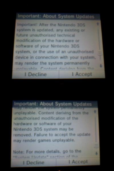 La semaine dernière, une rumeur est apparue sur certains sites 3DS - pas ici car j'évite de relayer de simples rumeurs - indiquant que Nintendo avait la possibilité, via une mise à jour, de briquer purement et simplement la 3DS de quiconque aurait tenté une utilisation illégale de la console (on pense bien sûr à l'emploi d'une R4 pour faire tourner des isos DS). On disait même qu'au Japon certains utilisateurs auraient déjà eu leur console briquée par Nintendo !